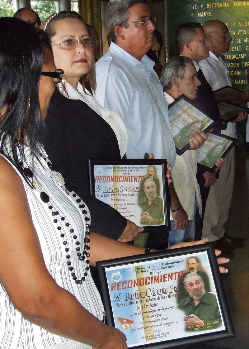 Dependientes gastronómicos, camareras, recepcionistas, chóferes de ómnibus, técnicos de alojamiento, promotores de ventas, obreros de mantenimiento y agentes de seguridad y protección, recibieron el agasajo durante un acto efectuado en el Memorial José Martí en La Habana, con la presencia de Salvador Valdés Mesa, vicepresidente del Consejo de Estado y Ulises Guilarte De Nacimiento, presidente de la Comisión Organizadora del XX Congreso de la Central de Trabajadores de Cuba.