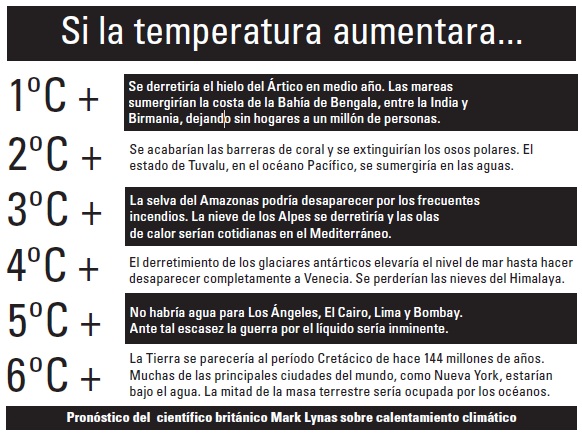 A la par, la Agencia Internacional de Energía pronosticó que la temperatura podría elevarse hasta 3,6 grados si los gobiernos no hacen nada para impedirlo. Otros científicos más pesimistas indican un incremento de hasta 5,5 grados para los próximos cincuenta años.