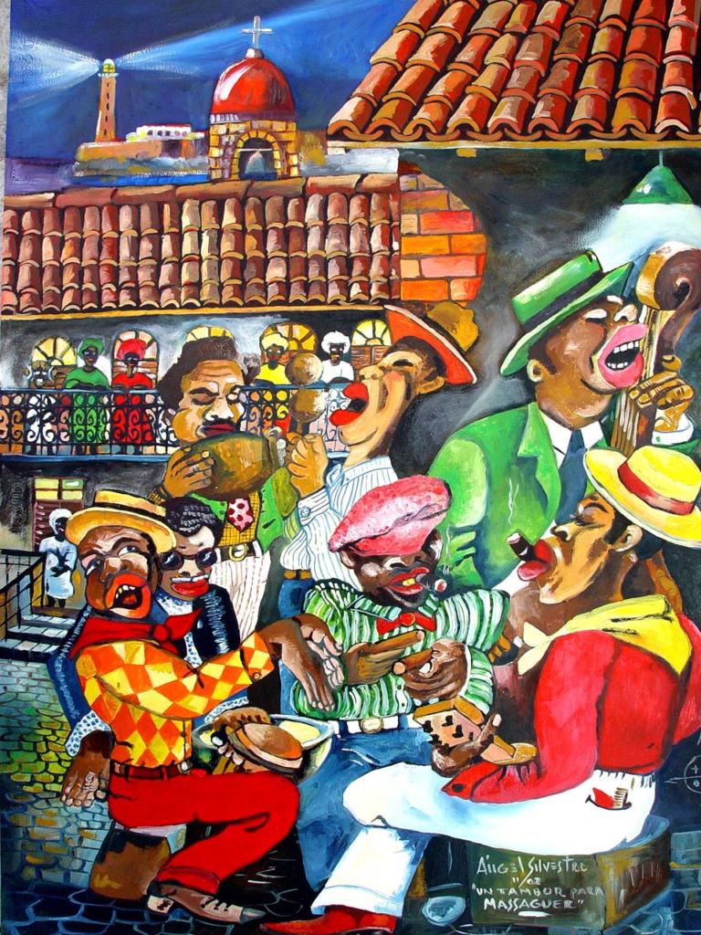 Picaresco de pura cepa, Ángel Silvestre Díaz Morales (Caimito, Artemisa, 1951), sencillamente Silvestre, nos acerca a su onírico universo de cubanía, a su “bestiario” de negros, mulatos y blancos desenfrenados por el sexo, la ironía, el doble sentido, la sátira y el humor costumbrista, extraídos de las más profundas fibras de nuestra idiosincrasia insular. Bajo el fogoso sol del Caribe, en Bauta o Guayabal, él pinta lo visible y lo etéreo para que podamos vernos, percibirnos, hallarnos, y hasta reir.