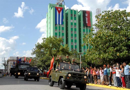 El cielo se llenó de palomas, en el aire ondearon banderolas multicolores, pañoletas, se agitaron flores, se entonaron himnos de guerra y canciones patrióticas… El uniforme verde olivo, que hace 55 años olía a pólvora, era el atuendo del futuro.