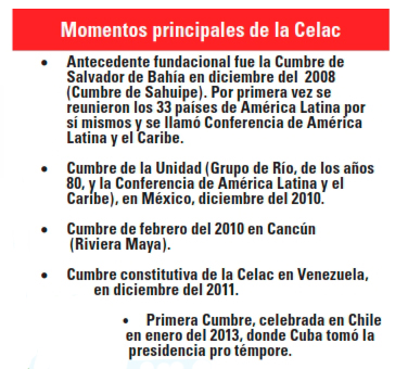 Dentro de este escenario, el más amplio paso para integrar nuestra comunidad de naciones a partir del principio de la más amplia unidad posible dentro de la diversidad, está presente en la Comunidad de Estados Latinoamericanos y Caribeños (Celac), un mecanismo no exento de desafíos que agrupa en condición de iguales a los 33 Estados de nuestra área sin la mediación y el tutelaje de las potencias del Norte. Su nacimiento es considerado como el suceso institucional más importante de la región en un siglo.