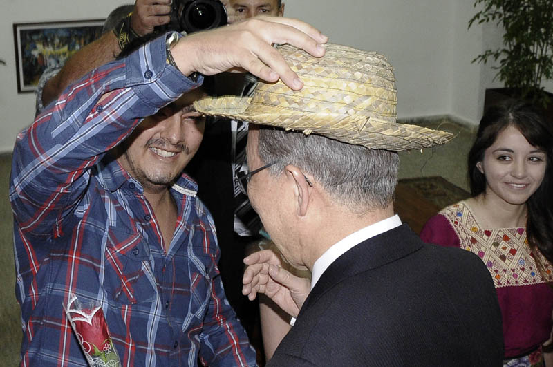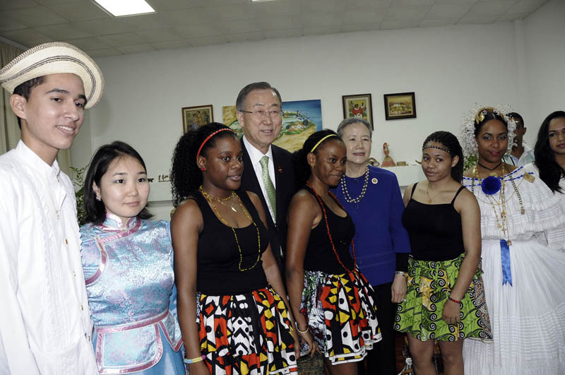 Luego de escuchar un saludo que en nombre de los estudiantes realizó Rosi Narváez, de Perú, y apreciar estampas danzarias de Asia, América Latina y África protagonizadas por los mismos jóvenes, el secretario general de la ONU conversó con ellos.