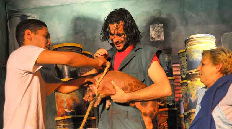 Estévez logra el resto del decorado a través de la extraordinaria ambientación de todo el espacio, es decir, tanto del área donde se produce la escenificación —ingeniosamente adaptada para esta pieza hacia el fondo de la sala, al no disponer aún del tablado, ya adquirido y almacenado— como la zona reservada para los espectadores, la cual, de cierta manera, semeja una cochiquera —que favorablemente alude al tema de la obra— debido al símil creado por los muros sobre los que descansará el escenario.