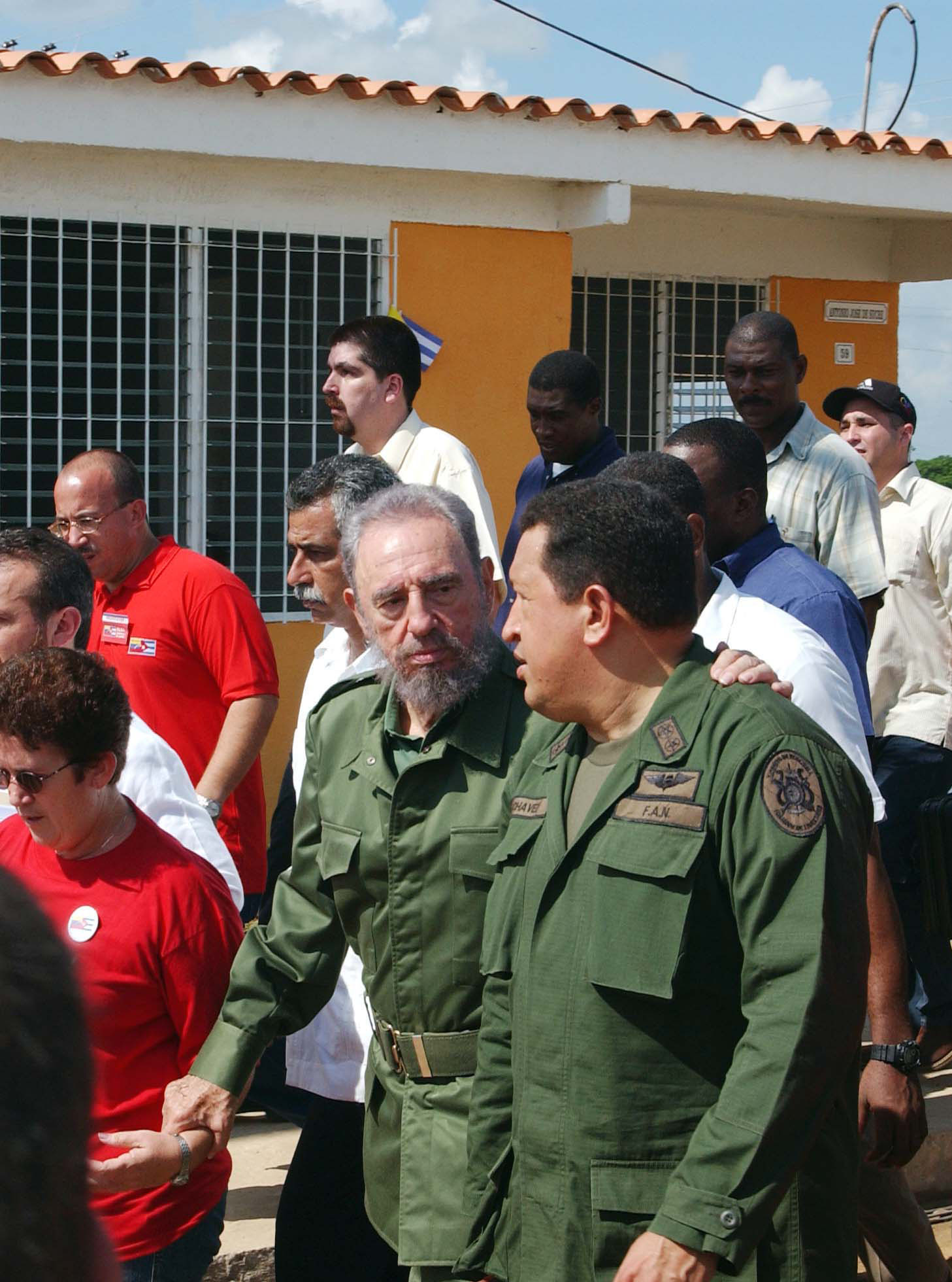 Visita de Hugo Chávez, presidente de la República Bolivariana de Venezuela y de Fidel a la provincia de Pinar del Río y en especial al poblado de Sandino, para hacer el programa Haló Presidente que realiza cada domingo Chávez en Caracas desde el reparto Villa Simón Bolívar, construido por militares venezolanos para los damnificados de los huracanes que azotó esta parte del país. Foto: Juvenal Balán, diario Granma.