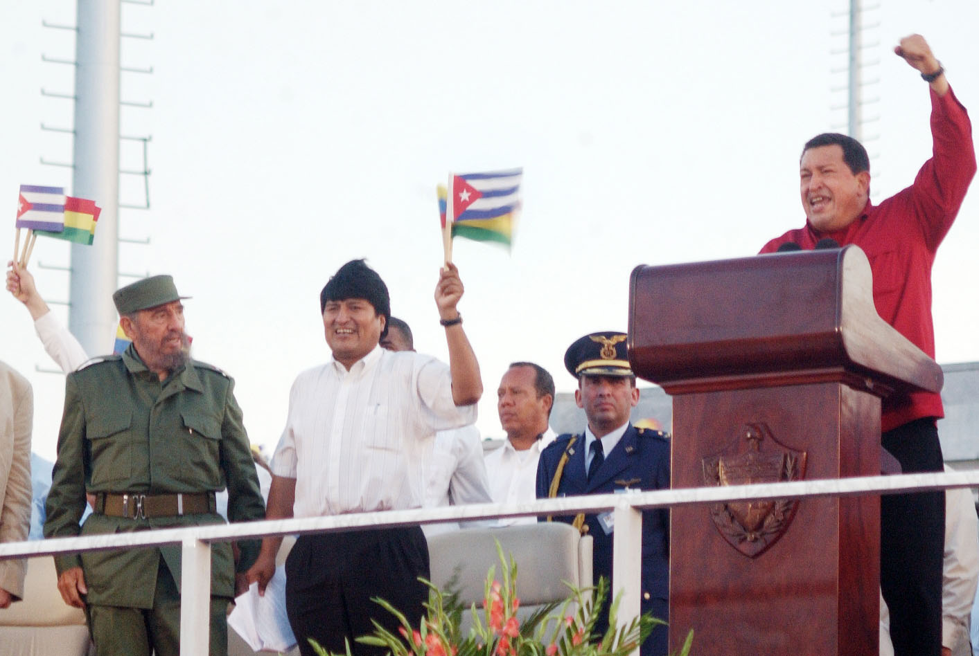 Acto por la Integración Latinoamericana en la Plaza de la Revolución en solidaridad por la visita de Hugo Chávez, (Interviniendo desde el podio) Fidel Castro Ruz, entonces presidente de la República de Cuba (Izquierda) al centro, Evo Morales, presidente de Bolivia. Foto: Joaquín Hernández Mena.