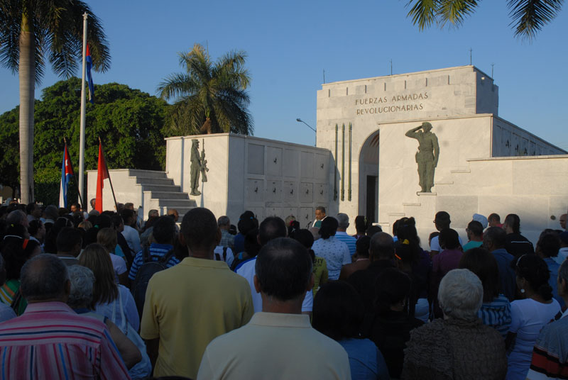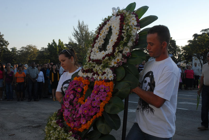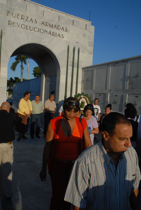 En la ceremonia, Guilarte junto a  Aila Peña Roche y Lázaro Peña Castellanos, hijos del querido dirigente, depositaron una ofrenda floral ante el nicho ubicado en el Panteón de las Fuerzas Armadas Revolucionarias.