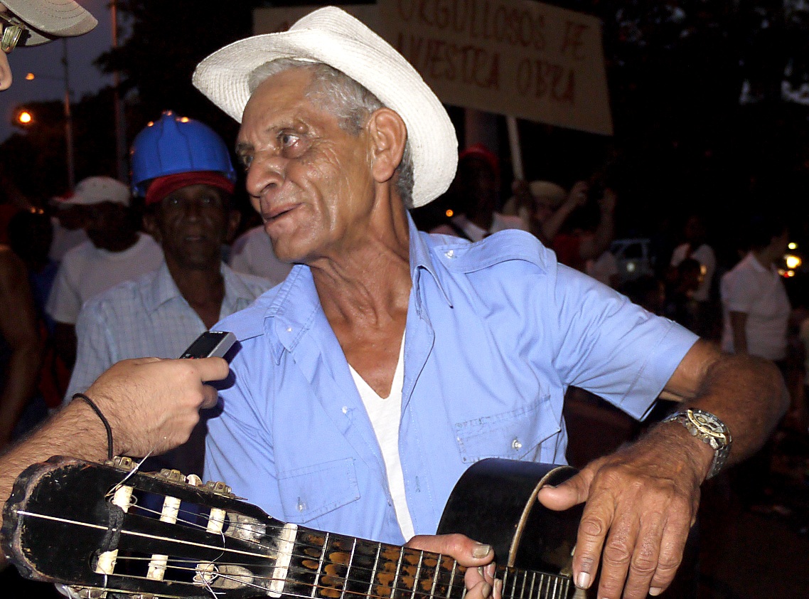 Juan Mariano Rodríguez, un veterano chofer del Ejército Occidental de las FAR, recorre el desfile con su guitarra, cantando sin parar. Al detenerlo un momento para conversar, sigue poniendo acordes, y solo luego de que termina su improvisación, me dice: “yo soy campesino de la Sierra Maestra, y entonces me gusta cantar canciones y por eso estoy aquí con la guitarra”, y con la misma sigue su rumba por la calle, improvisando más.