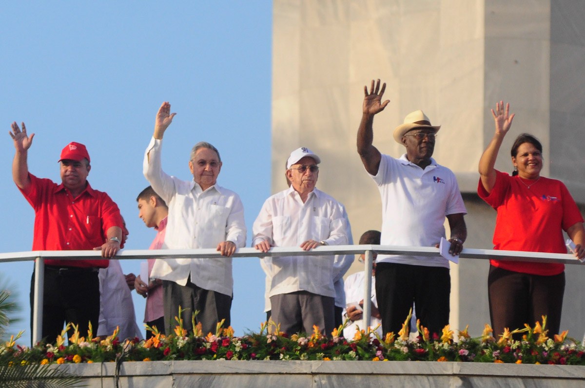 El General de Ejército Raúl Castro Ruz, presidente de los Consejos de Estado y de Ministros, preside el acto central nacional y desfile del Primero de Mayo, que comenzó este miércoles a las 7 y 30 de la mañana en la histórica Plaza de la Revolución José Martí, en La Habana.