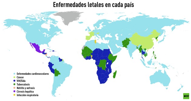 ¿Cuáles son las dolencias que provocan más muertes en todo el mundo? Un mapa creado a partir de datos de la Organización Mundial de la Salud ofrece una respuesta a esta pregunta.