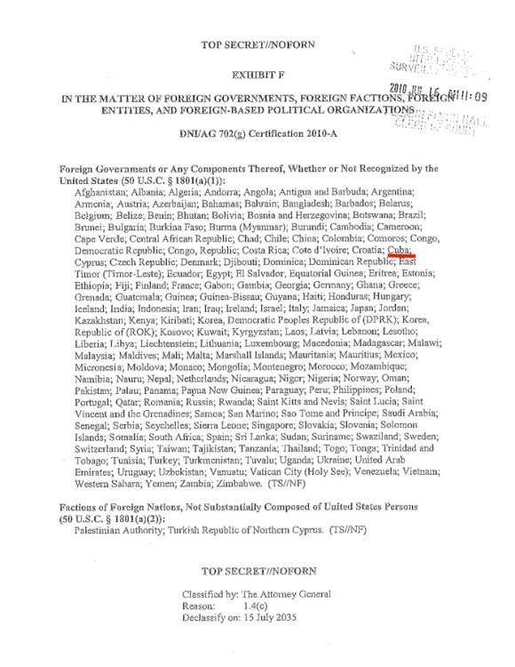 The Washington Post acaba de publicar la lista de los 193 objetivos claves que Estados Unidos somete a estrecha vigilancia, entre los que se encuentran gobiernos extranjeros, grupos, organizaciones políticas y otras entidades que integraron una orden oficial de 2010 aprobada por el Tribunal de Vigilancia de Inteligencia Extranjera (Foreign Intelligence Surveillance Court).