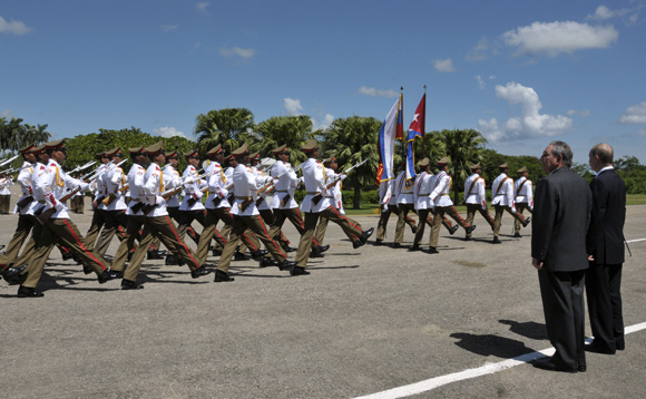 Junto al jefe de Estado cubano, en el Memorial recibieron al gobernante ruso el canciller Bruno Rodríguez Parrilla y el General de Cuerpo de Ejército Álvaro López Miera, viceministro primero del MINFAR y Jefe del Estado Mayor General.