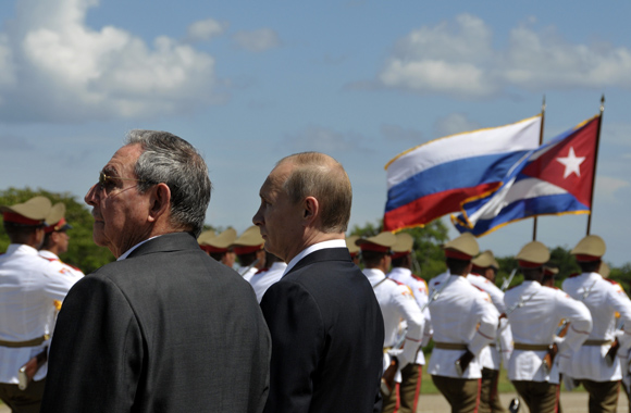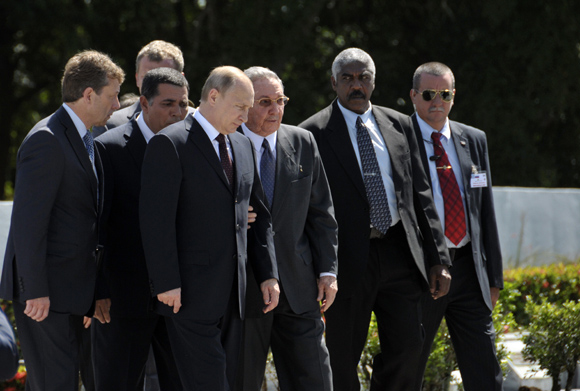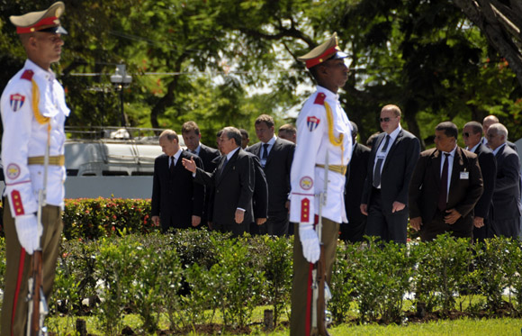 Vladimir Putin, presidente de la Federación de Rusia, y Raúl Castro, presidente de los Consejos de Estado y de Ministros de Cuba, depositaron este viernes una ofrenda floral en el Memorial al Soldado Internacionalista Soviético, ubicado en las afueras de La Habana.