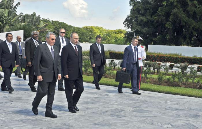 Vladimir Putin, presidente de la Federación de Rusia, y Raúl Castro, presidente de los Consejos de Estado y de Ministros de Cuba, depositaron este viernes una ofrenda floral en el Memorial al Soldado Internacionalista Soviético, ubicado en las afueras de La Habana.