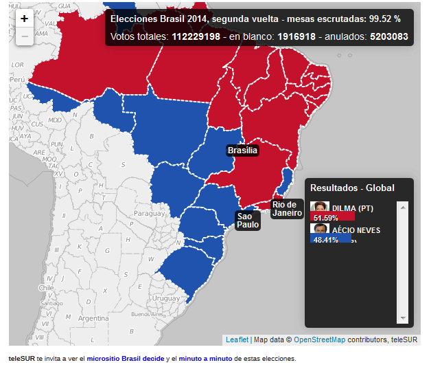 De acuerdo con la información suministrada por el Tribunal Supremo Electoral de Brasil, tras un escrutinio del 98,29 por ciento de los votos, la actual Jefa de Estado y de Gobierno y candidata por el PT, Dilma Rousseff, resultó vencedora en la segunda vuelta electoral con un 51,48 por ciento de los sufragios, sobre su contendor Aécio Neves, del Partido de la Social Democracia Brasileña (PSDB) quien alcanzó un 48,52 por ciento del apoyo electoral.