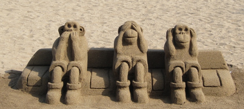 No veo, no oigo, no hablo, he ahí la filosofía de Mizaru, Kikazaru e Iwazaru, más conocidos como los tres monos sabios, místicas figuras de origen asiático, que según se dice fueron enviados a la tierra por los dioses para delatar las malas acciones de los humanos, esos que con el ir y venir de los años trastocaron la leyenda, asumiéndola bajo el presupuesto de que es mejor no ver, no escuchar, no hablar, con tal de evitarse problemas.