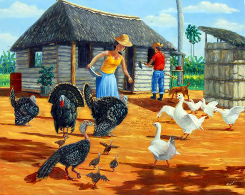 “En mis cuadros —expresó— utilizo colores vivos, los de nuestra patria”. En ese aspecto, sus trabajos tienen mucho que ver con el autodidactismo de los naif, quienes prefieren los tonos brillantes y contrastantes. También en ellos se evidencia el interés por la frescura y el lirismo que definió a este tipo de pintura en Francia hacia finales del siglo XIX, entre cuyos fundadores se encuentra el célebre pintor Henri Rousseau (Laval, 1844 – París, 1910)2.Alimentando la cría - El Guajiro que pinta -Rogelio Fundora Ybarra - Cuba