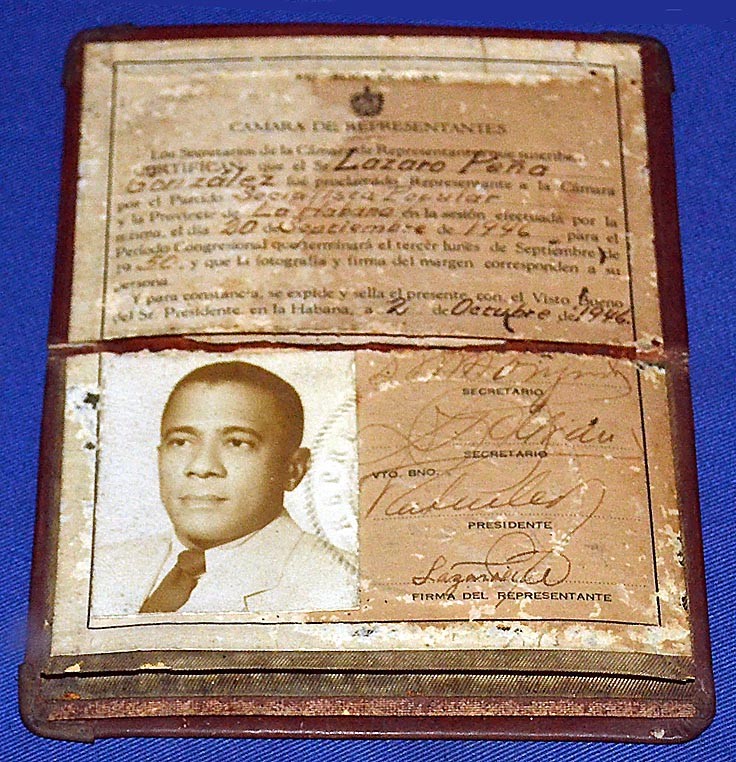 8 Carné de miembro de la Cámara de Representantes extendido a nombre de Lázaro Peña González, líder del movimiento sindical cubano.