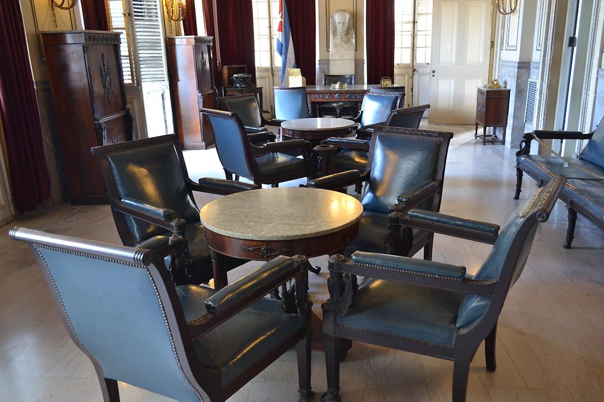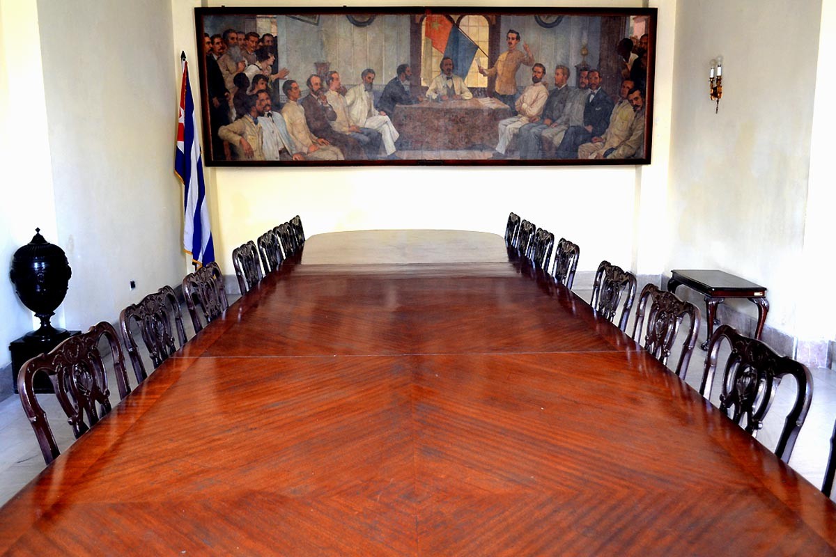 Salón del Consejo de Ministros, con su mobiliario original. Detrás, la enseña nacional y un óleo alusivo a la Asamblea de Guáimaro, que el 10 de abril de 1869 aprobó la primera Constitución de la República de Cuba en Armas y los símbolos patrios.