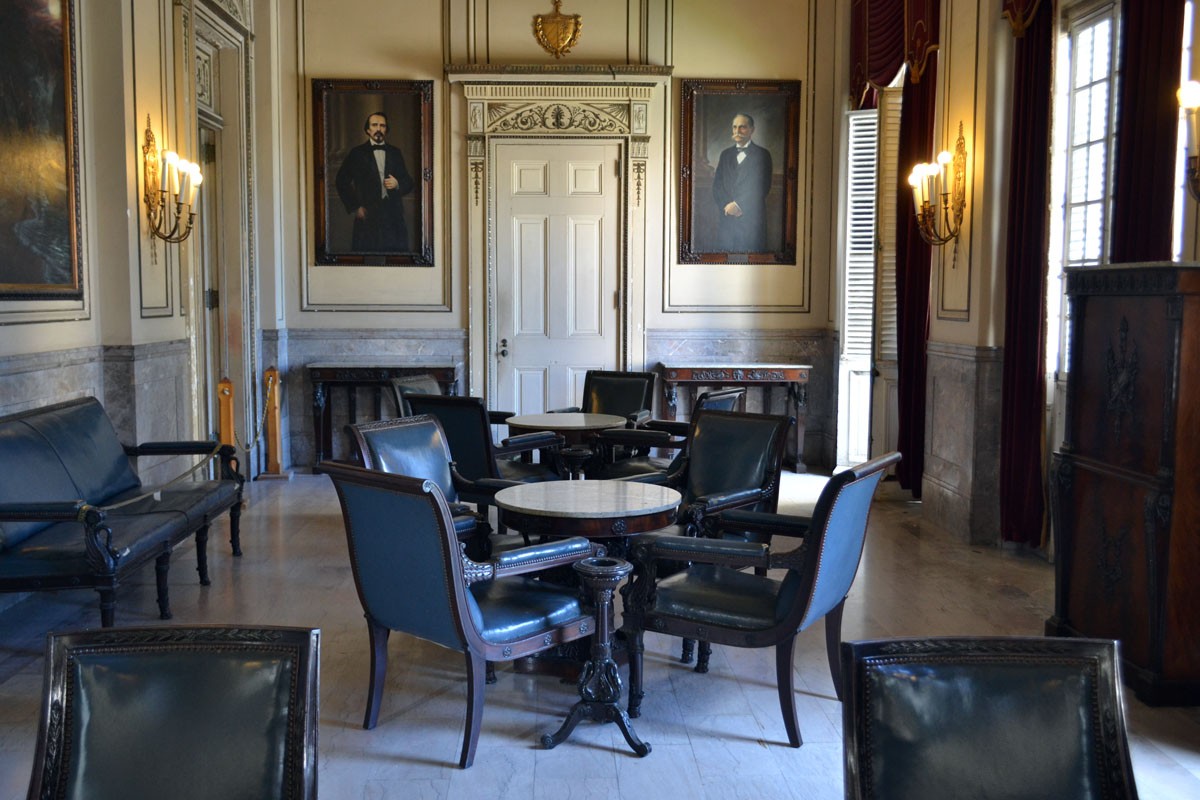 El despacho presidencial visto desde otro ángulo. Al fondo, los óleos de Carlos Manuel de Céspedes, primer presidente del gobierno de la República de Cuba en Armas, a la izquierda; y de Tomás Estrada Palma, quien presidió el gobierno que, instaurado el 20 de mayo de 1902, puso fin a la intervención militar estadounidense.