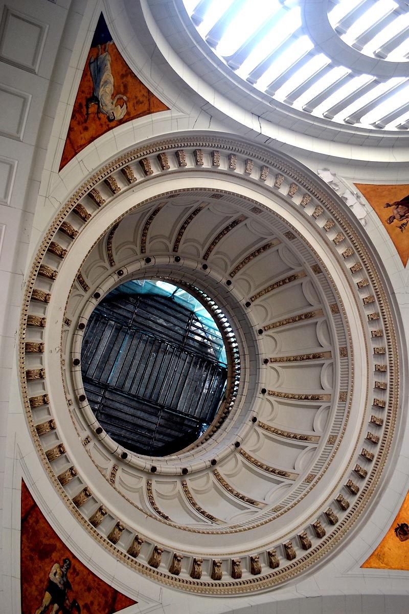 Vista interior de la cúpula, en la actualidad sometida a trabajos de restauración. En los arcos torales que descienden de ella, figuran cuatro pechinas alusivas a la mitología griega, debidas al arte de Esteban Valderrama y Mariano Miguel González.