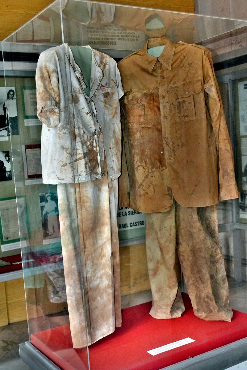 Pijama y uniforme del ejército gubernamental utilizados por los participantes en el asalto al cuartel Moncada y el hospital civil Saturnino Lora, en Santiago de Cuba, el 26 de julio de 1953. Se aprecian manchas de la sangre derramada por algunos de los asaltantes.