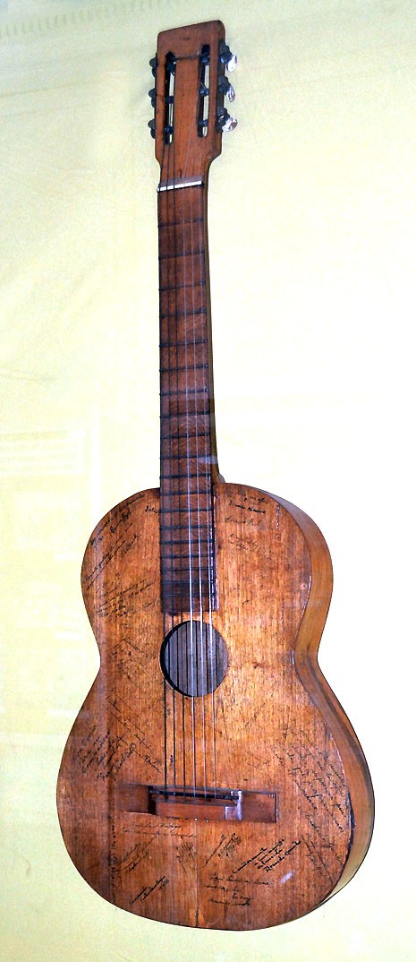 Guitarra usada por Juan Almeida Bosque en el presidio de la entonces Isla de Pinos —en la actualidad Isla de la Juventud—, donde cumplía condena por su participación en el asalto al cuartel Moncada.