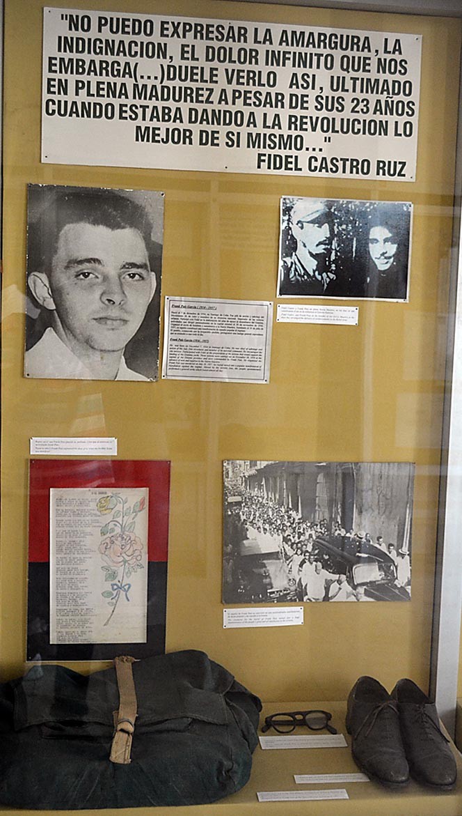 Mochila, espejuelos y zapatos que pertenecieron a Frank País García, jefe nacional de acción del Movimiento Revolucionario 26 de Julio. Frank dirigió el levantamiento armado del 30 de noviembre de 1956, en apoyo a la expedición armada, y organizó la red de suministros a la guerrilla establecida en la Sierra Maestra.