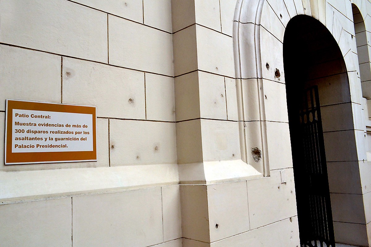 Algunas de las más de 300 evidencias dejadas en el patio central por los proyectiles disparados durante el asalto al palacio, el 13 de marzo de 1957. Fueron develadas durante el actual proceso de restauración del edificio.