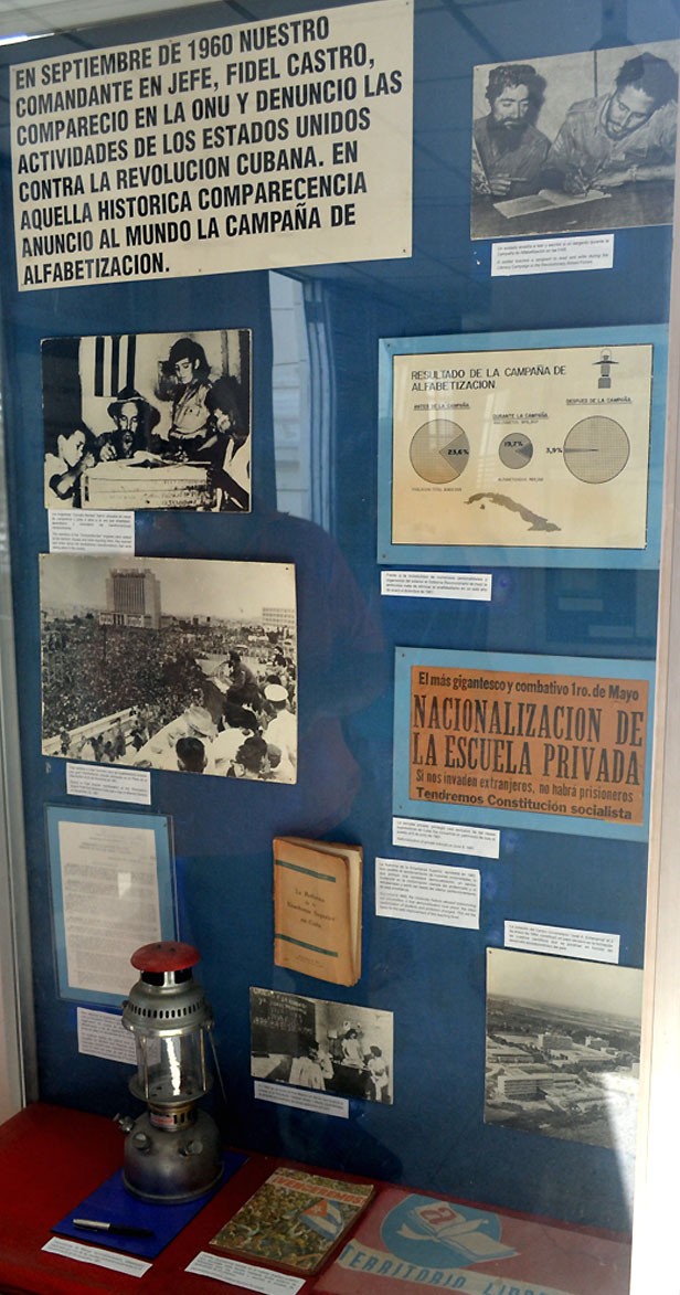 Fotos y objetos recrean la Campaña Nacional de Alfabetización, mediante la cual en 1961 Cuba fue declarada Territorio Libre de Analfabetismo.