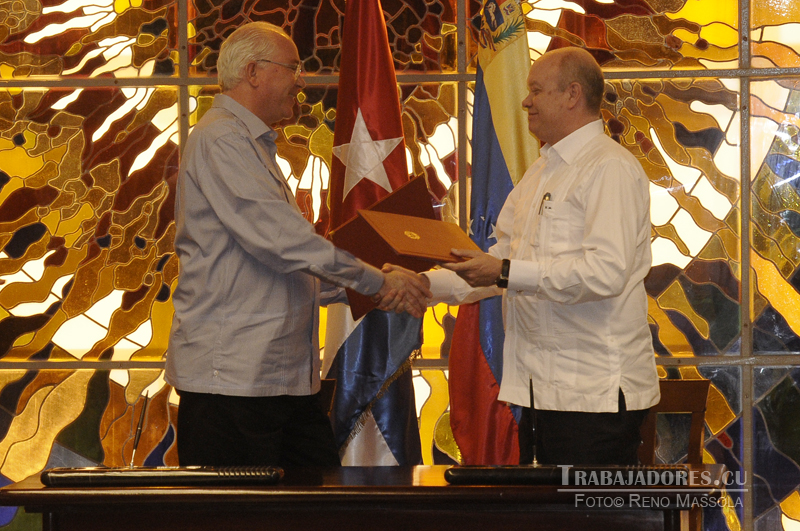 Firma de acuerdos entre Cuba y Venezuela, Rafael Ramírez Carreño, Vicepresidente para el área política y Ministro del Poder Popular para las Relaciones Exteriores de Venezuela, y Ena Elsa Velázquez, Ministra de Educación de Cuba