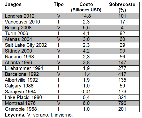 En la tabla anexa se aprecian los costos de 17 certámenes olímpicos, sobre los cuales Stewart y Flyvbjerg alertan que quizás han quedado por debajo de lo real, hecho que agravaría aún más la situación descrita. Sus conclusiones establecen que todos los Juegos estudiados incurrieron en sobrecostos, lo cual ha causado daños a las naciones anfitrionas. La mejor metáfora para ilustrar lo sucedido es “haber firmado un cheque en blanco”.