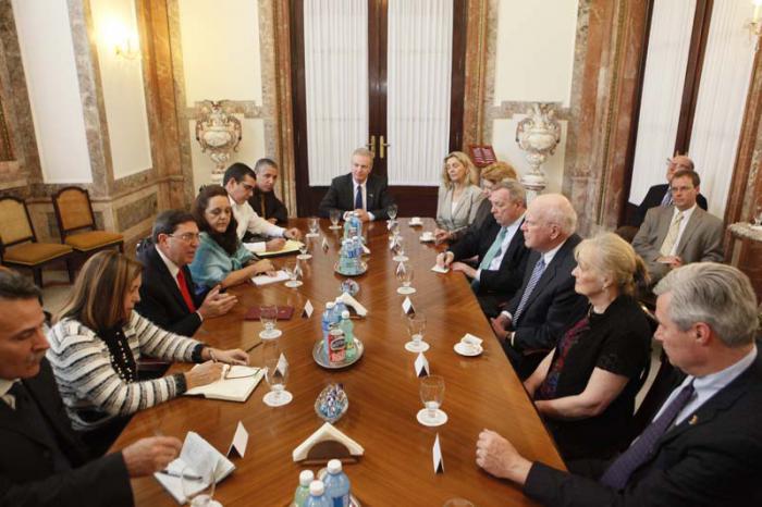 El Ministro de Relaciones Exteriores, Bruno Rodríguez Parrilla, recibió en la tarde de este lunes 19 de enero a los senadores Patrick Leahy (Vermont), Richard Durbin (Illinois), Sheldon Whitehouse (Rhode Island) y Debbie Stabenow (Michigan), y a los representantes Christopher van Hollen (Maryland) y Peter Welch (Vermont), todos del Partido Demócrata.