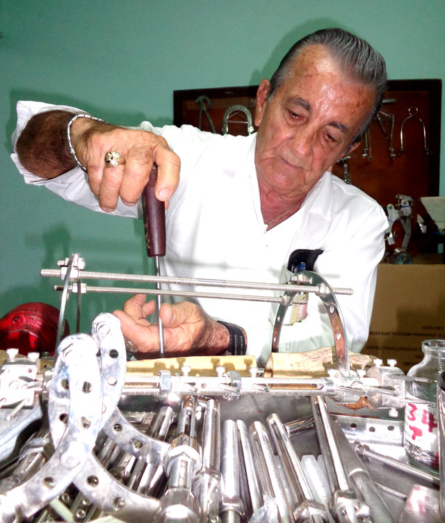 Raul Mata Garcia is an octogenarian technician from the Ministry of Health and he has on his desk at work external fixers, sheets, crews and other accessories he fixes and modifies and turns him into a genius of surgery tools.