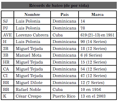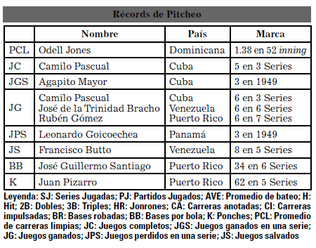 En el apartado del pitcheo, Camilo Pascual (Habana y Cienfuegos) es el recordista de más juegos completos (5), mientras Agapito Mayor (Almendares) conserva la difícil marca de tres triunfos en una misma serie (1949 frente a los Indios de Mayagüez, de Puerto Rico, 11-4 y 8-5, y contra el Supur Cola, de Panamá, 5-2). Asimismo, pero con el madero en ristre, Lorenzo Cabrera (Habana) está inscrito en el libro de los inmortales con el mayor promedio para un líder de bateo, gracias al 619 que promedió en 1951.