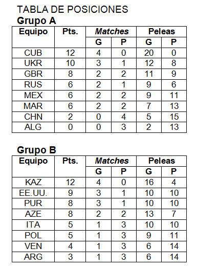 Las acciones del fin de semana en la llave A se completaron con la barrida de Rusia sobre los Guerreros de México (5-0 peleas); el claro triunfo (4-1) de los Corazones de León Británicos sobre los Halcones del Desierto argelino; y el sorpresivo éxito de los Leones Atlas de Marruecos sobre los Otamans de Ucrania (3-2).