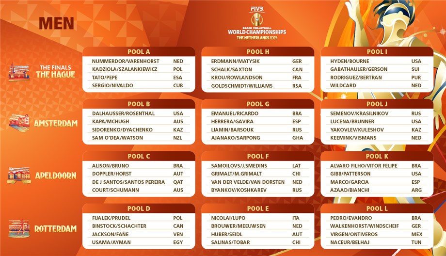 En el sexo varonil, la dupla de Sergio González y Nivaldo Díaz aparece ubicada en el pool A, junto a duetos de Holanda, Polonia y El Salvador.