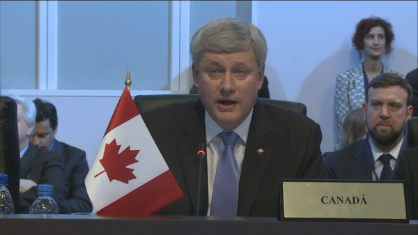 Durante su intervención en la VII Cumbre de las Américas, Harper recordó Canadá es uno de los miembro más jóvenes de la Organización de Estados Americanos (OEA), pero eso no limita su compromiso con la organización.