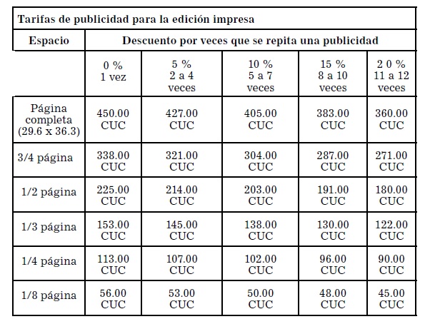 Sobre el costo de los clasificados, Katia Batista Noa, jefa del departamento Comercial de la AIN, precisó a Trabajadores que de dos a 10 líneas cuesta 0.85 centavos CUC; a partir de ese espacio se abonará 1.00 CUC por cada línea. Puntualizó que cada una contiene 30 caracteres en letra tipo Gotham XNarrow a 9 puntos, y se contratarán dos líneas como mínimo.
