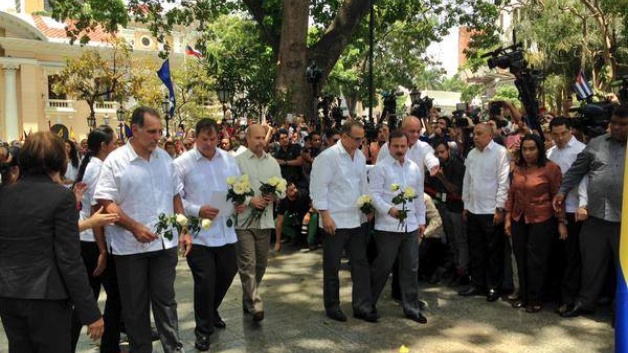Los cinco héroes antiterritoristas cubanos colocaron este lunes una ofrenda floral en la Plaza Bolívar de Caracas (Venezuela) en tributo al Libertador Simón Bolívar y recibieron las Llaves de la Ciudad, que los califica como invitados ilustres.