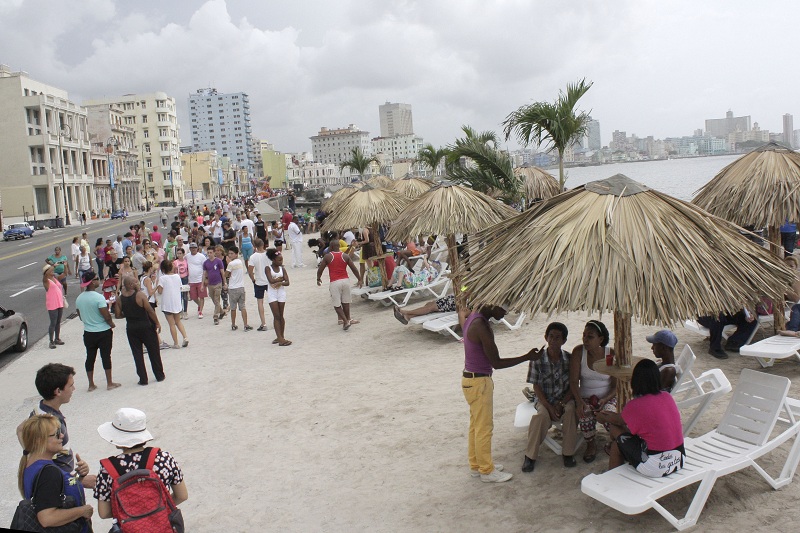 Numerosos curiosos, críticos, especialistas, curadores y público en general se reunieron en la Plaza de la Catedral para disfrutar del performance del artista italiano Michelangelo Pistoletto, una de las personalidades más célebres que nos visitan; mientras que en la tarde de ayer domingo, desde La Punta hasta el parque Maceo, el Malecón habanero era un hormiguero. Niños, jóvenes, ancianos disfrutaron de las múltiples instalaciones ubicadas allí a través del proyecto Detrás del Muro, de Juanito Delgado, en su segunda edición. En la foto, una de las propuestas más sonadas y atractivas de esa exhibición. Se trata de Resaca, de Arles del Río (Cuba), quien convirtió un segmento del Malecón (ensenada, entre Genios y Crespo), en un envidiable balneario en medio de la inmensa urbe. Según el joven creador, con esta obra pretende manipular el espacio para recrear un ambiente natural que provoque en el espectador una ilusión surrealista del entorno; una verdadera utopía, un lugar de descanso y reflexión.