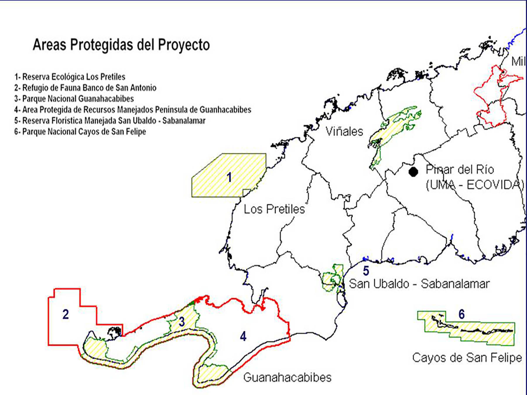 Además de las primeras mencionadas, el proyecto incluyó el refugio de fauna Banco de San Antonio, el área protegida de recursos manejados Península de Guanahacabibes y la reserva florística manejada de San Ubaldo-Sabanalamar.