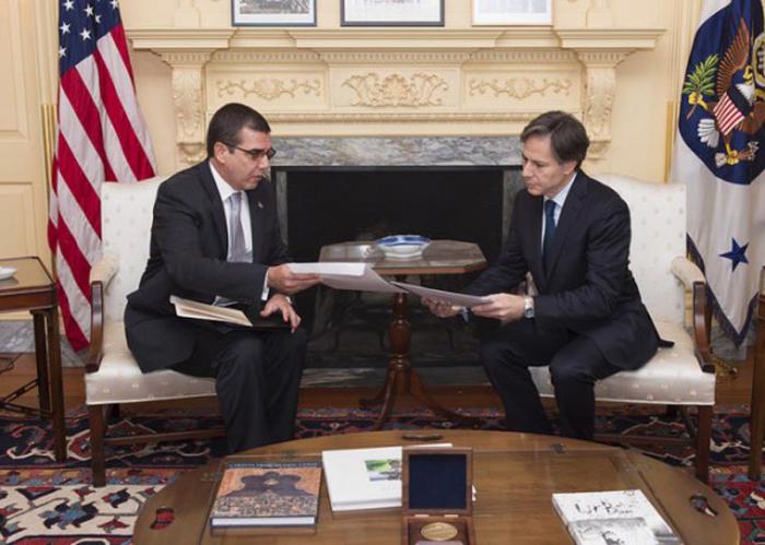 El jefe de la Sección de Intereses de Cuba en Washington, José Ramón Cabañas Rodríguez, fue recibido en la mañana de hoy en el Departamento de Estado por el secretario de Estado interino Anthony Blinken, a quien hizo entrega de una carta del General de Ejército Raúl Castro Ruz, presidente de los Consejos de Estado y de Ministros, al presidente Barack Obama, en lacual confirma la decisión de la República de Cuba de restablecer las relaciones diplomáticas con los Estados Unidos de América y abrir embajadas en ambas capitales, a partir del 20 de julio de 2015