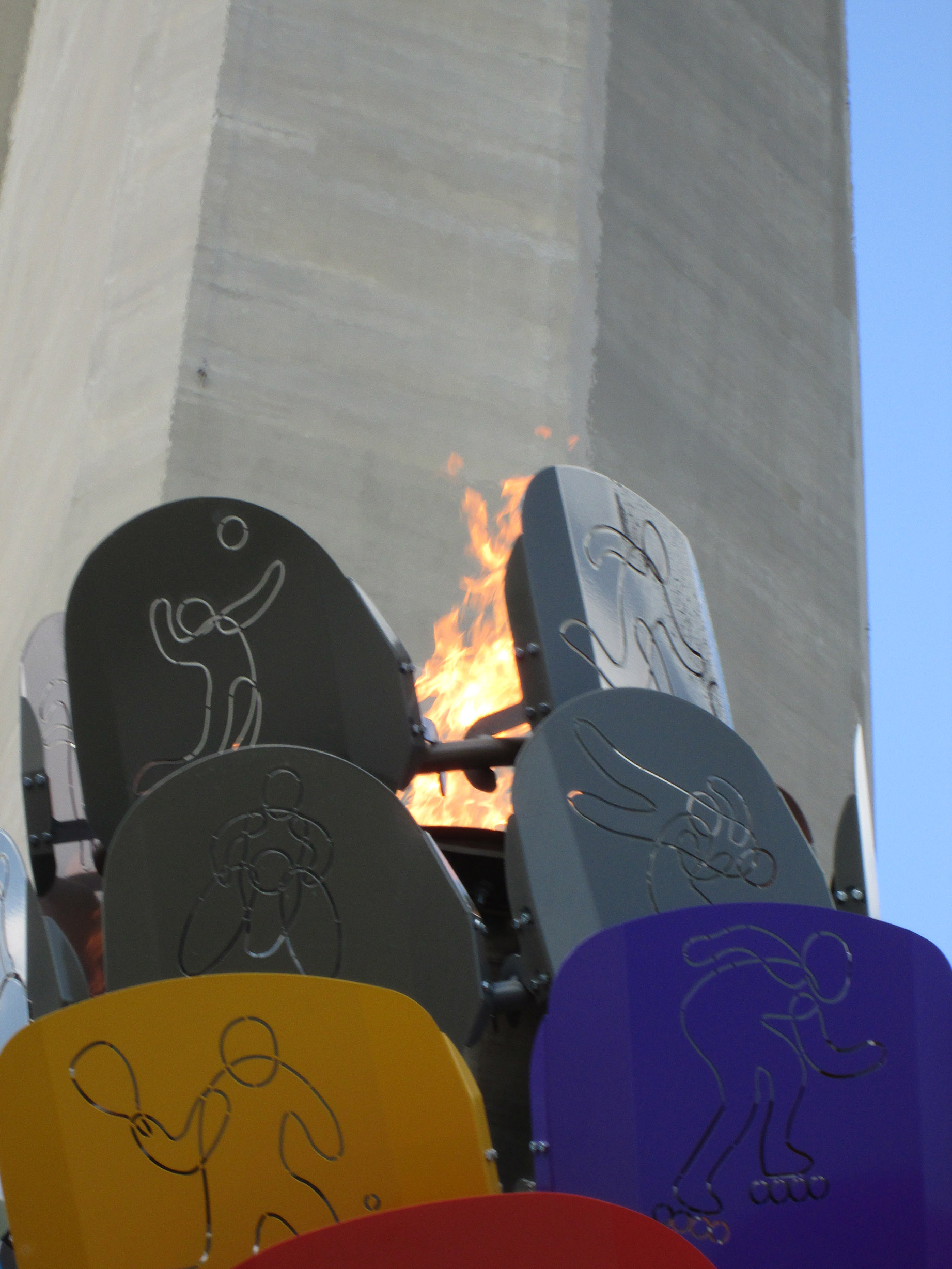La bellísima pira, creada en forma de flor, posee 41 pétalos que representan a las naciones que intervienen en la competencia y contienen grabados los emblemas de varias disciplinas convencionales y paralímpicas.