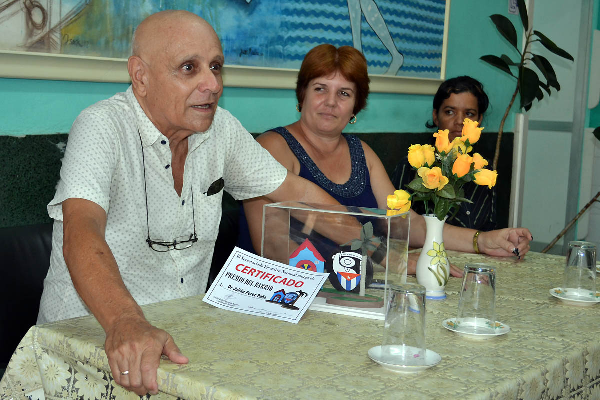 Julia Durruthy, integrante del secretariado de los CDR, puso en manos del doctor Pérez Peña el estímulo que esa organización de masas –la mayor del país-entrega para reconocer a colectivos, familias y personas que se entregan sin descanso a los demás, forjan, juntan, potencian y con su ejemplo, perseverancia y tenacidad demuestran la unidad indestructible de la Revolución.