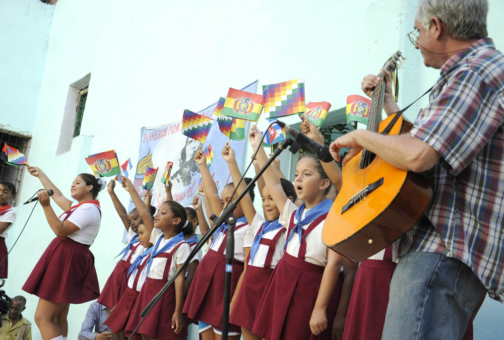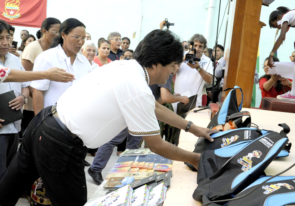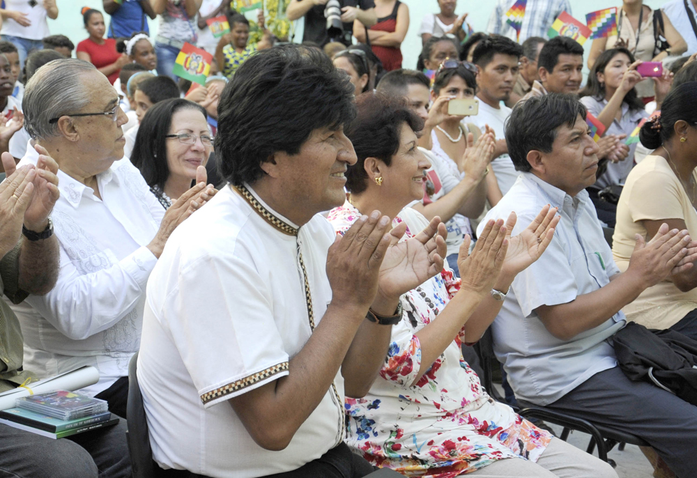 El mandatario estuvo acompañado por el canciller boliviano David Choquehuanca, y Ena Elsa Velázquez, ministra de Educación de Cuba, entre otras personalidades.