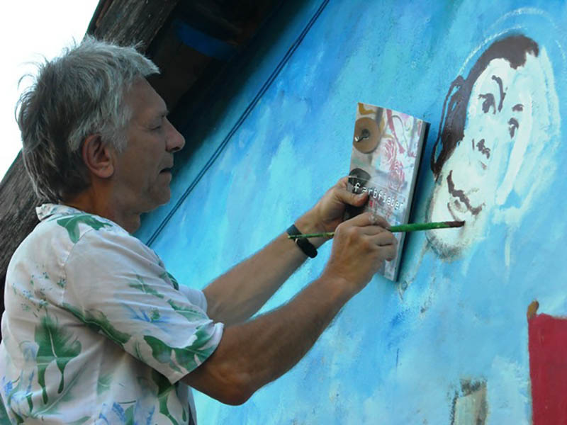 En la foto el artista alemán Klaus Klinger, mientras restauraba el mural Tengo fe en el destino. Foto: Leyanet Abreu