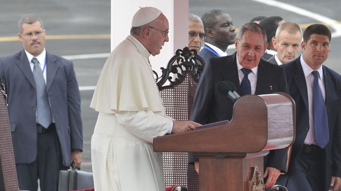 Como el Presidente señaló, este año 2015 se celebra el 80 aniversario del establecimiento de relaciones diplomáticas ininterrumpidas entre laRepública de Cuba y la Santa Sede. La Providencia me permite llegar hoy a esta querida Nación, siguiendo las huellas indelebles del camino abiertopor los inolvidables viajes apostólicos que realizaron a esta Isla mi dos predecesores, san Juan Pablo II y Benedicto XVI. Sé que su recuerdo suscitagratitud y cariño en el pueblo y las autoridades de Cuba. Hoy renovamos estos lazos de cooperación y amistad para que la Iglesia siga acompañando yalentando al pueblo cubano en sus esperanzas y en sus preocupaciones, con libertad y con los medios necesarios para llevar el anuncio del Reinohasta las periferias existenciales de la sociedad.