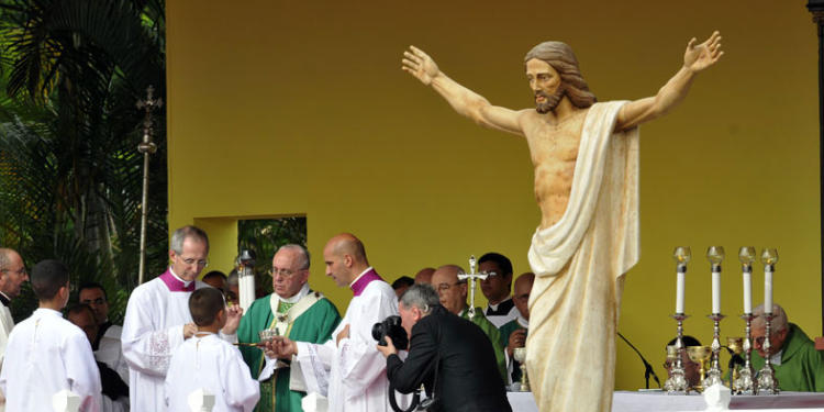 El santo Pueblo fiel de Dios que camina en Cuba, es un pueblo que tiene gusto por la fiesta, por la amistad, por las cosas bellas. Es un pueblo que camina, que canta y alaba. Es un pueblo que tiene heridas, como todo pueblo, pero que sabe estar con los brazos abiertos, que marcha con esperanza, porque su vocación es de grandeza. Hoy los invito a que cuiden esa vocación, a que cuiden estos dones que Dios les ha regalado, pero especialmente quiero invitarlos a que cuiden y sirvan, de modo especial, la fragilidad de sus hermanos. No los descuiden por proyectos que puedan resultar seductores, pero que se desentienden del rostro del que está a su lado. Nosotros conocemos, somos testigos de la «fuerza imparable» de la resurrección, que «provoca por todas partes gérmenes de ese mundo nuevo» (cf. Evangelii gaudium, 276.278).