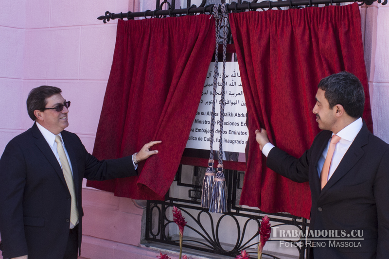Bruno Rodríguez Parilla, ministro de Relaciones Exteriores de la República de Cuba y su Alteza el Jeque Abdullah Bin Zayed Al-Nahyan, ministro de Asuntos Exteriores de los Emiratos Árabes Unidos (EAU), develaron en la tarde de este lunes la tarja conmemorativa de la inauguración de esa misión diplomática en nuestro país, sita en el capitalino municipio Playa.