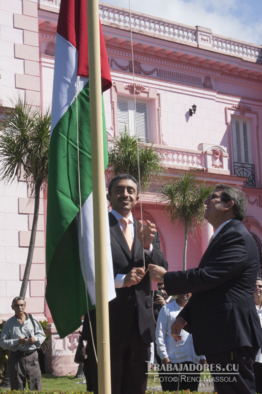 Ambos Cancilleres procedieron también al izamiento de la insignia nacional del país árabe, que estableció sus relaciones diplomáticas con la isla en 18 de marzo del año 2002.